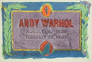 Jeff Schaller, a Philadelphia artist, painted this image. Schaller first created an actual rubbing of Warhol's headstone, and then silkscreened this rubbing on top of a hand painted image.