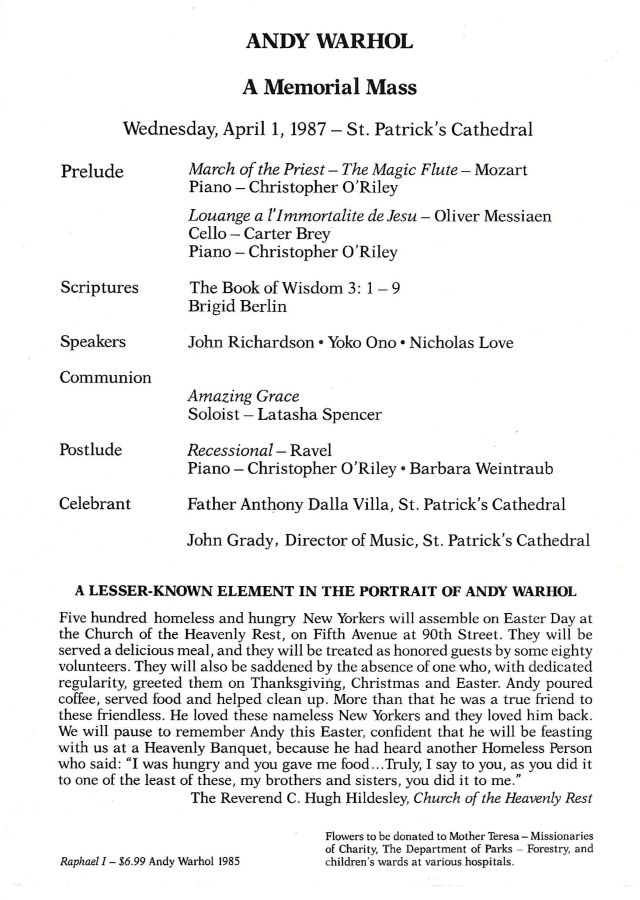 The memorial service was held on April 1, 1987 at Manhattan's St. Patrick's Cathedral.